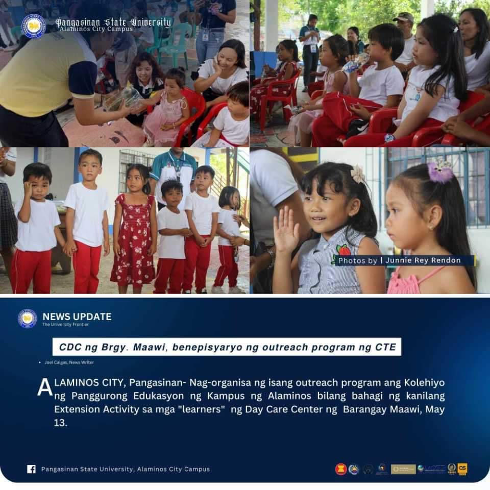 ALAMINOS CITY, Pangasinan- Nag-organisa ng isang outreach program ang Kolehiyo ng Panggurong Edukasyon ng Kampus ng Alaminos bilang bahagi ng kanilang Extension Activity sa mga “learners” ng Day Care Center ng Barangay Maawi, May 13.