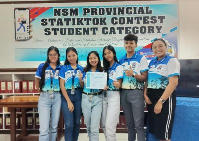In the Oratorical Competition, Ms. Michelle Joy Gutierrez, IV BSEd-English, with the help of her coaches, Ms. Zarah Jane B. Anuddin and Dr. Agerico F. Oboza, delivered a powerful and persuasive speech that captivated the judges and audiences, earning 1st Runner-Up among the participants. On the other hand, Jessa Diane Ladia, April Ann Arconcil, Trina Joy Mendez, Jennifer Tucay, and Mark Anthony Noblado, IV-BEEd students, showcased their statistical prowess in the STATISTOK Competition, securing 1stRunner-Up. Their achievement became possible with the guidance of their coach, Ms. Sixiane Kim Recepcion.